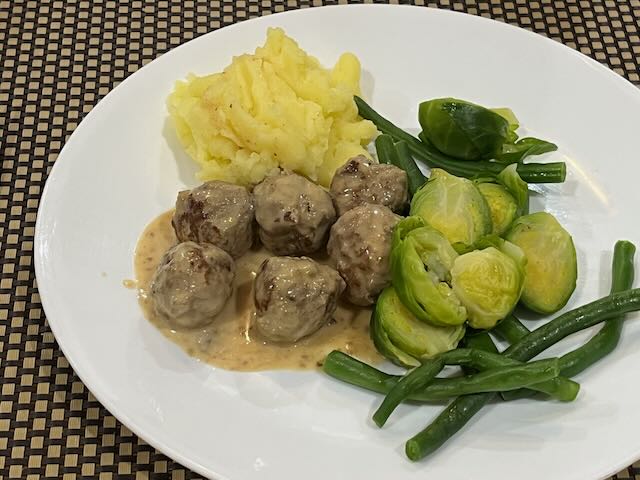 - Serve – 5-6 small meatballs per person with creamy sauce, ½ cup mash, and a generous side of Brussels + beans, or other suitable veg